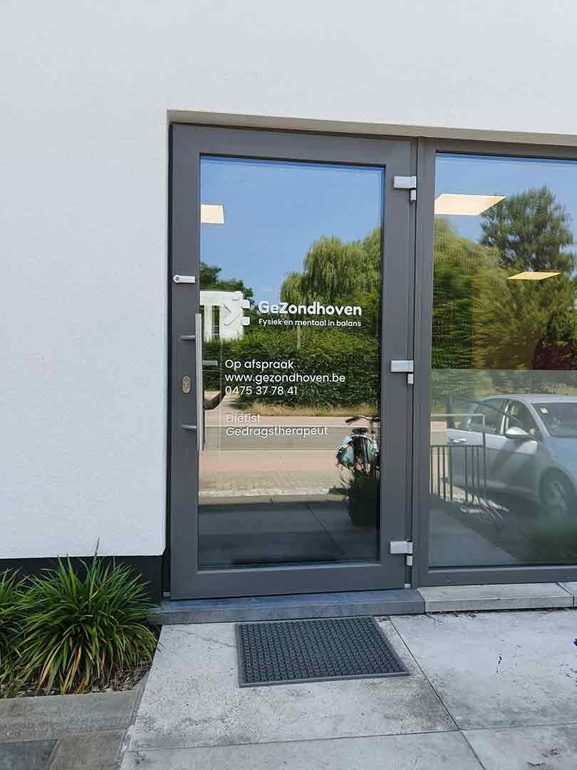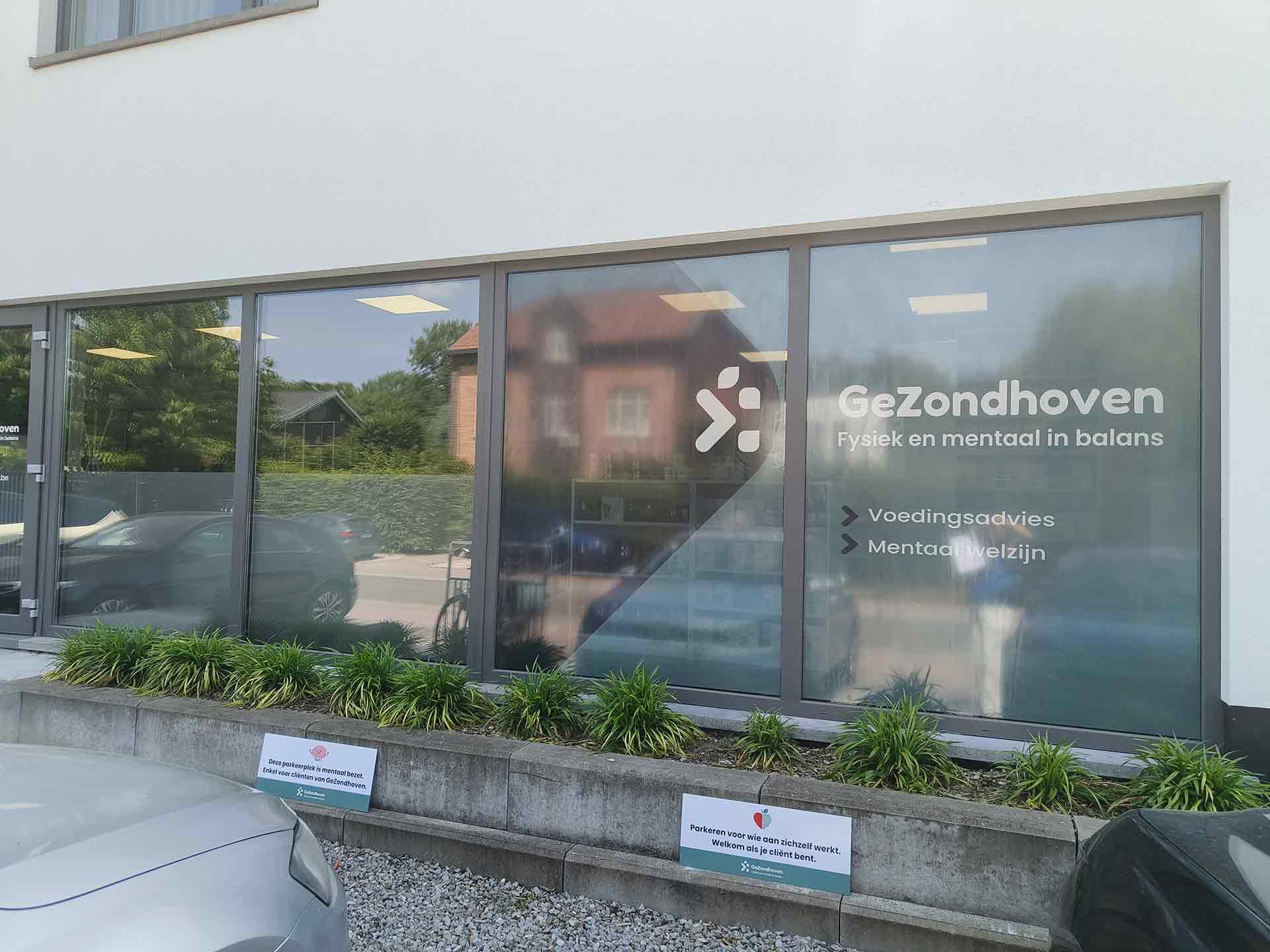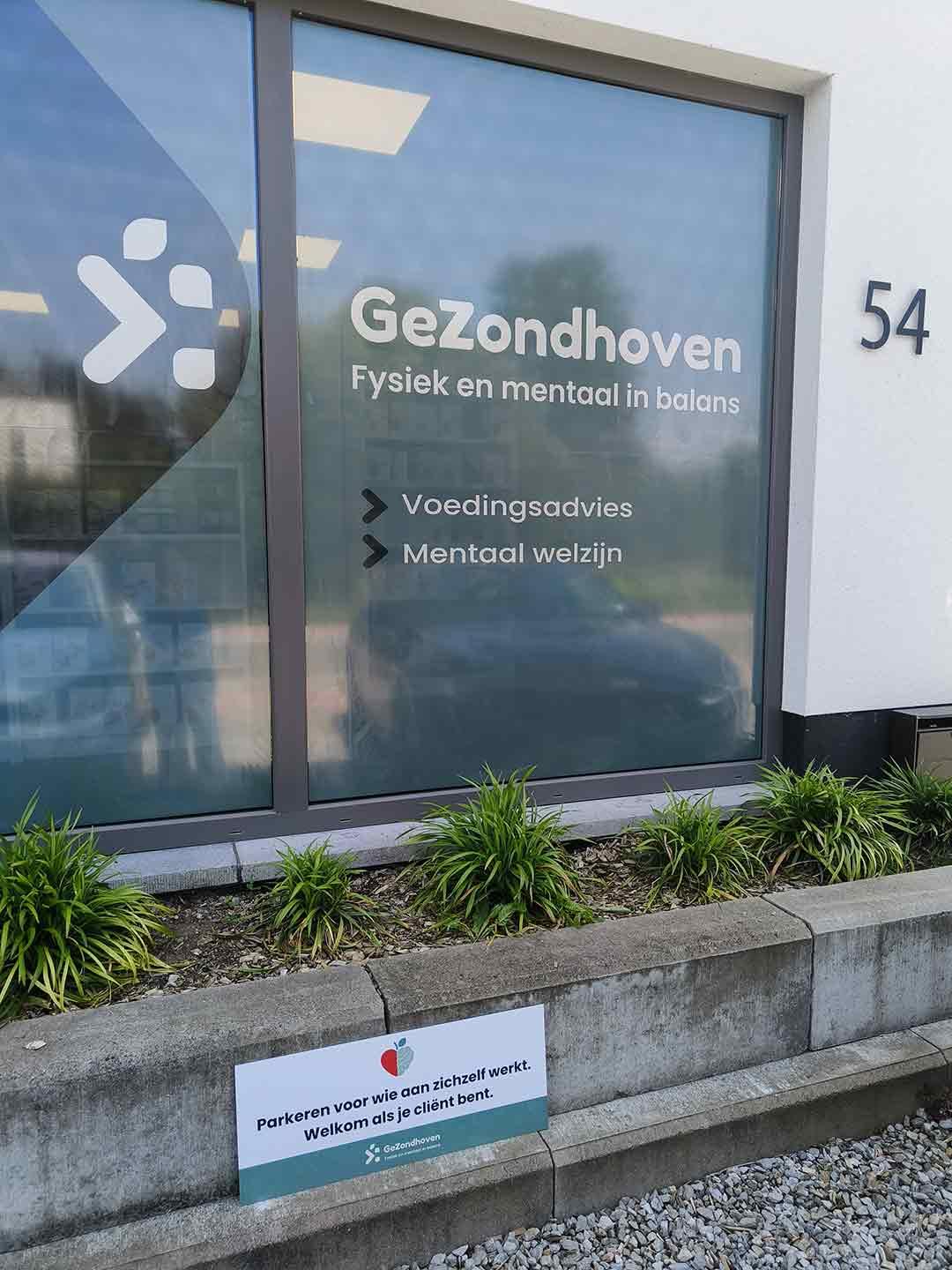 Voor GeZondhoven ontwierp ik de volledige belettering van de praktijk, met aandacht voor privacy, rust en een warme uitstraling. Het bestaande logo vormde het vertrekpunt voor een helder en evenwichtig ontwerp dat zowel uitnodigend als functioneel is.